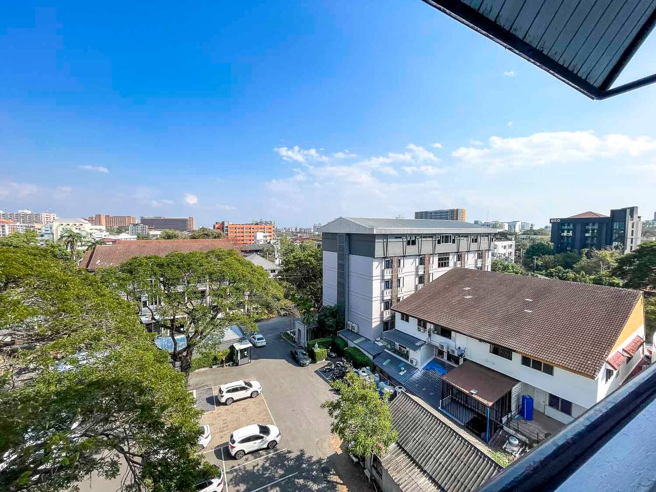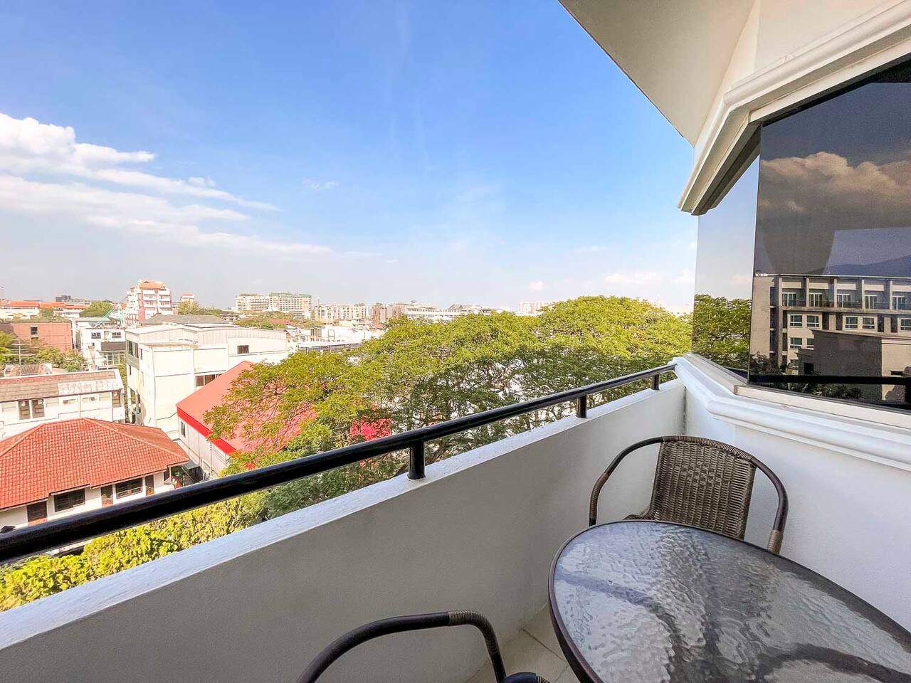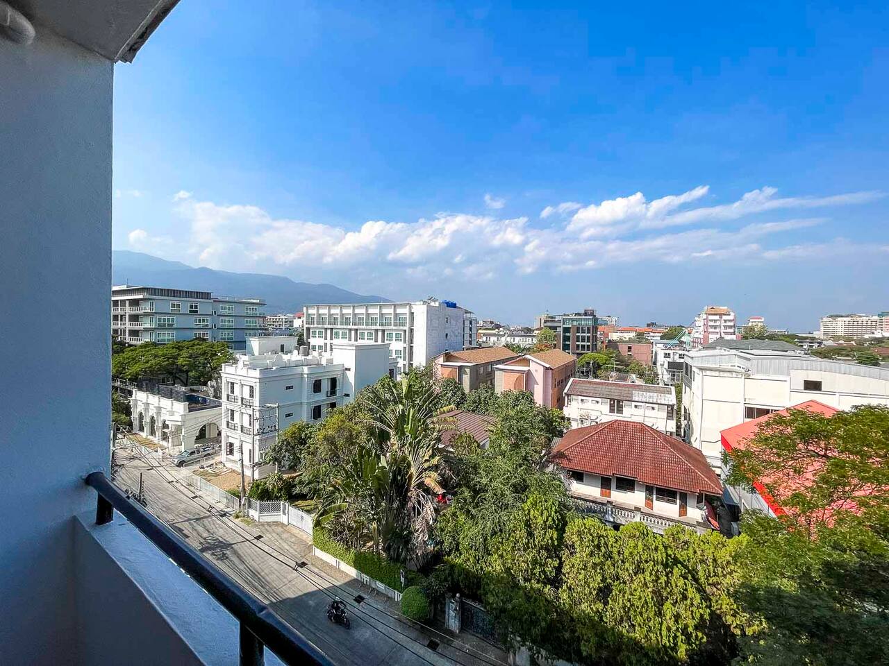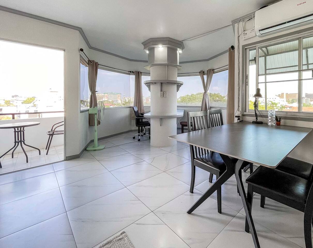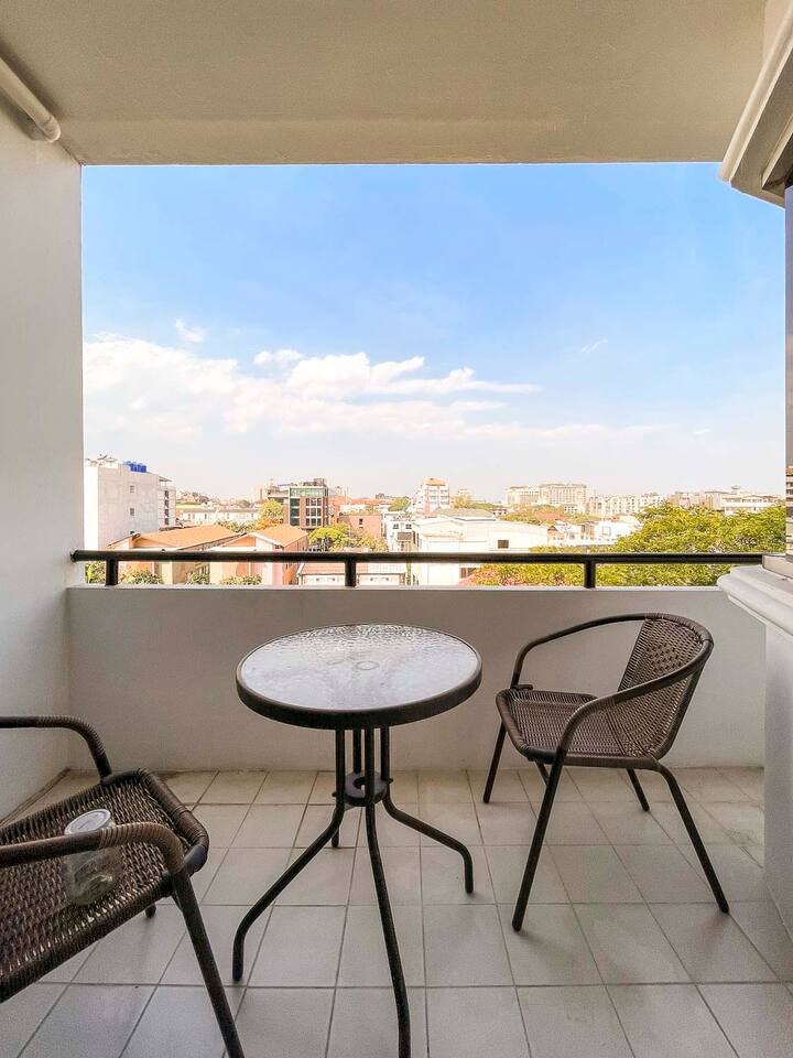 **Electricity cost is not included for stays of 28 days or longer** This is a spacious 80 sqm 1 bedroom apartment with a sofabed. Its on the 7th floor and has a nice balcony with northern view. The apartment is cool all day long and has a nice mountain and city view. There are two separate bathrooms as well and a dedicated work desk with nice city view. Biggest advantage of this apartment is the location. Its located in soi 15 of Nimmanhaemin and you can walk anywhere.