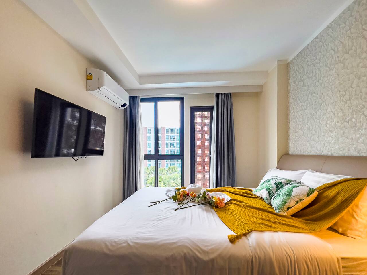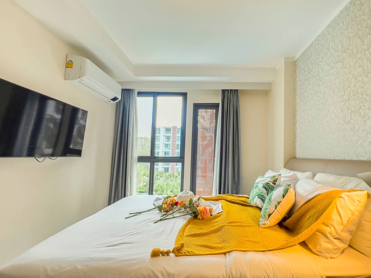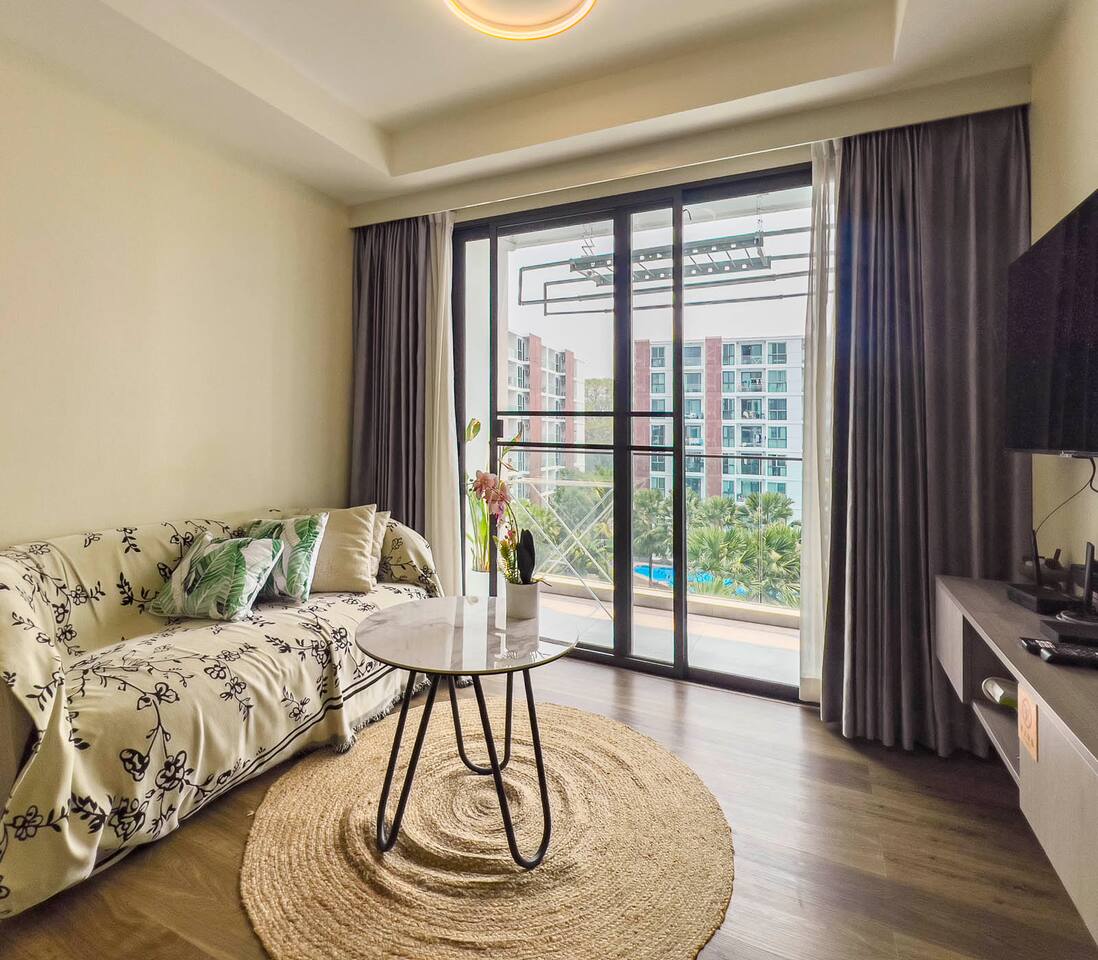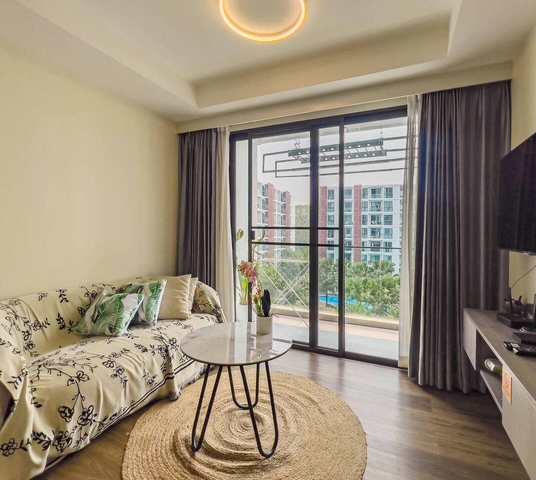 **Electricity cost is not included for stays of 28 days or longer** Space: Wake up to the stunning blue of the area's largest swimming pool. Ideal for couples or solo travelers, this unit offers a spacious and bright interior with high-speed private Wi-Fi. Enjoy a worry-free stay with fully equipped facilities and amenities. Minutes from Central Festival mall, 10 mins to Old City/Nimman.