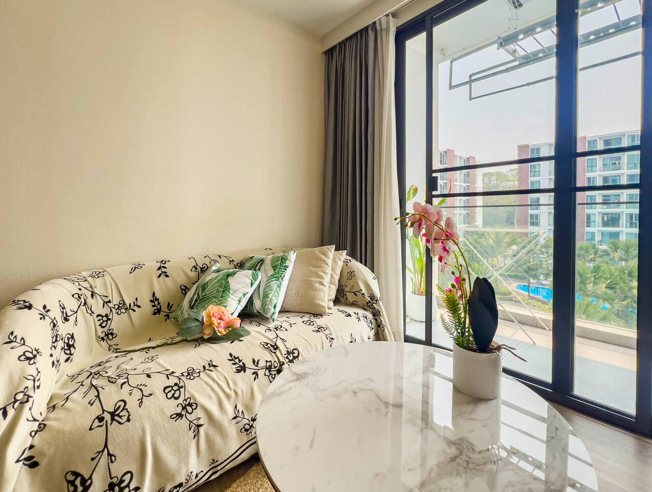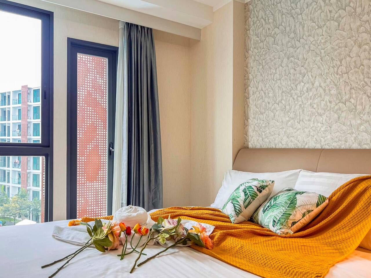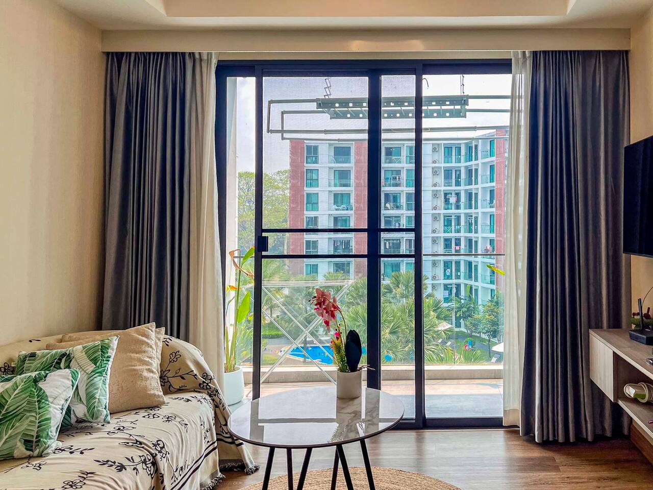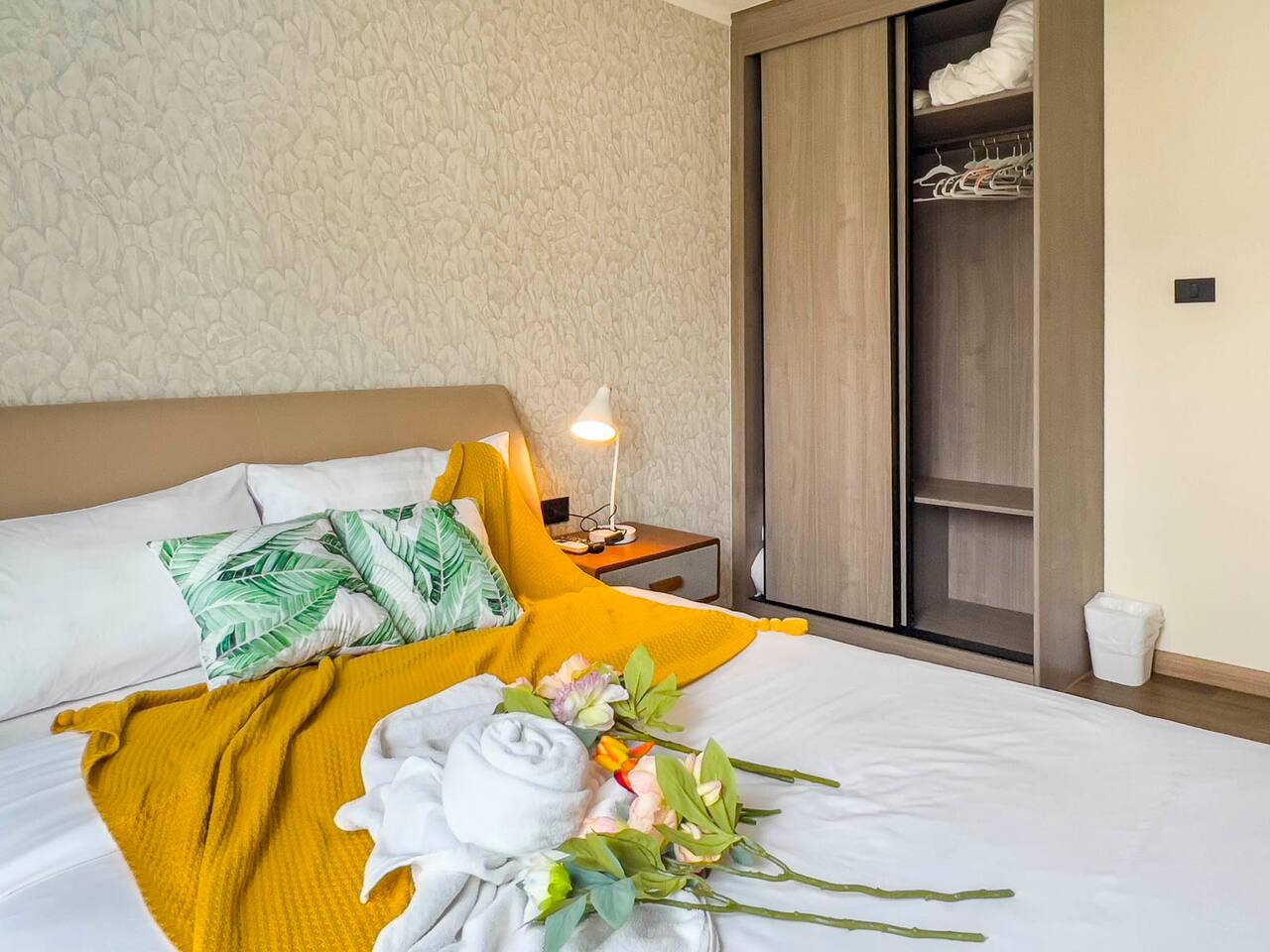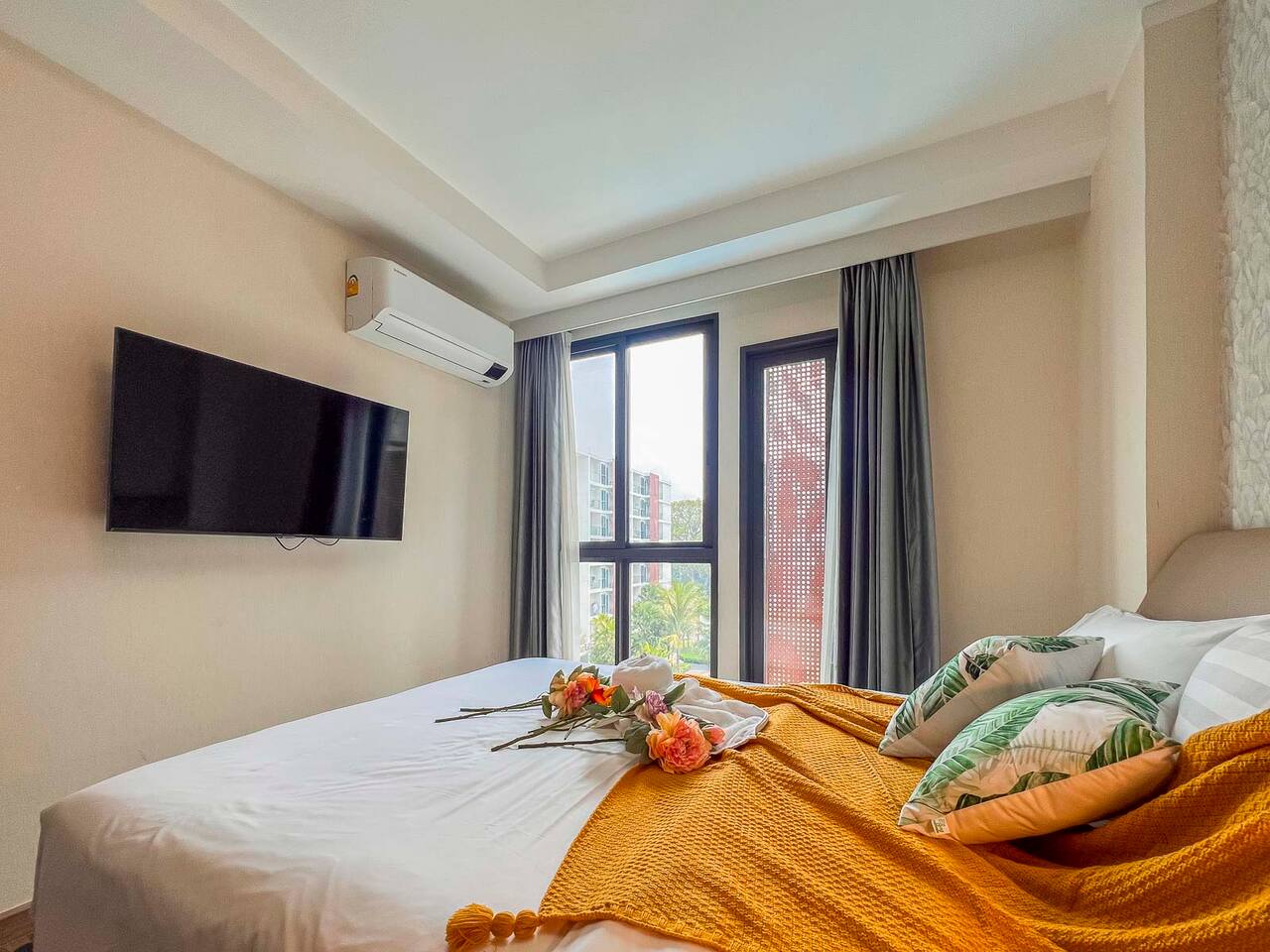 **Electricity cost is not included for stays of 28 days or longer** Space: Wake up to the stunning blue of the area's largest swimming pool. Ideal for couples or solo travelers, this unit offers a spacious and bright interior with high-speed private Wi-Fi. Enjoy a worry-free stay with fully equipped facilities and amenities. Minutes from Central Festival mall, 10 mins to Old City/Nimman.